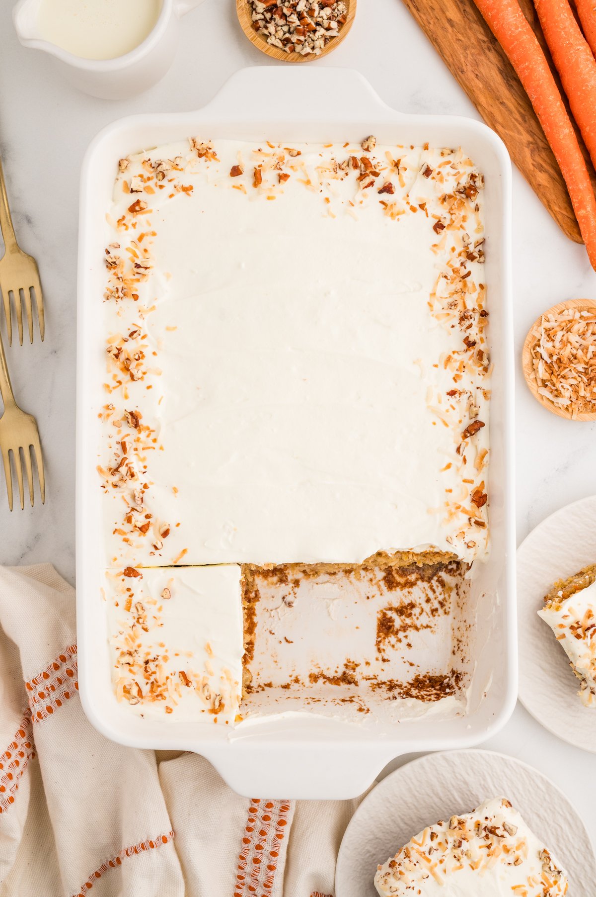 This moist and flavorful from scratch carrot poke cake is packed with shredded carrots, sweetened coconut, and crushed pineapple, creating a perfectly spiced base. After baking, the cake is soaked with a mixture of sweetened condensed milk and milk, making it rich, extra moist, and decadent. Topped with a creamy, smooth whipped cream cheese frosting and garnished with pecans and toasted coconut, it’s a yummy dessert that’s perfect for any occasion.
