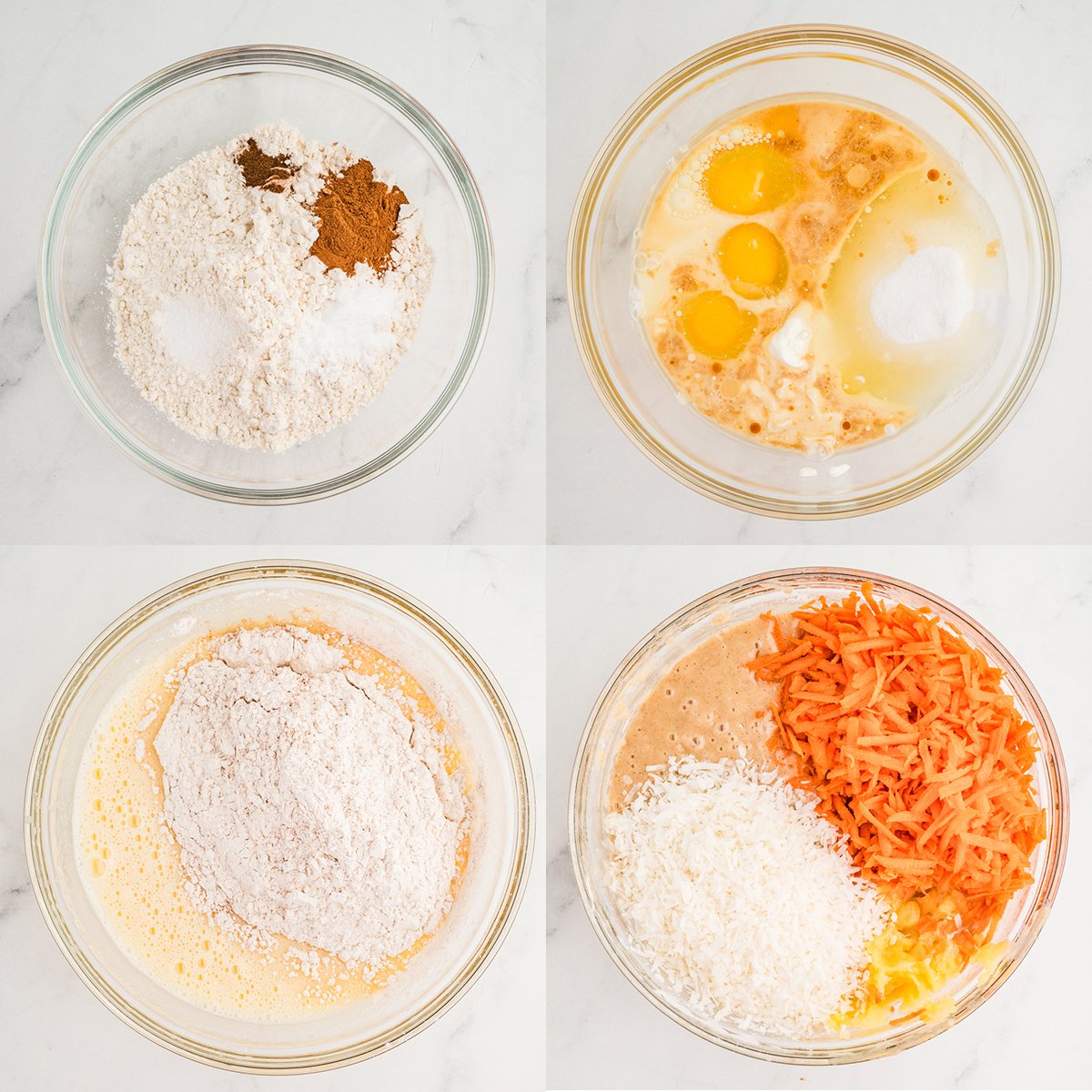 In a separate mixing bowl with a hand mixer mix together the eggs, oil, milk, sour cream, vanilla, and sugar until well combined. Add the dry ingredients and mix until almost combined. Add the carrots, coconut flakes, and pineapple and mix until just combined.