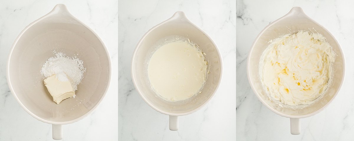 In the bowl of a stand mixer fitted with a whisk attachment, beat the cream cheese and powdered sugar until very smooth. It’s easiest to do this if the cream cheese is extra soft. Add the cream and beat until thick.