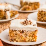 This moist and flavorful from scratch carrot poke cake is packed with shredded carrots, sweetened coconut, and crushed pineapple, creating a perfectly spiced base. After baking, the cake is soaked with a mixture of sweetened condensed milk and milk, making it rich, extra moist, and decadent. Topped with a creamy, smooth whipped cream cheese frosting and garnished with pecans and toasted coconut, it’s a yummy dessert that’s perfect for any occasion.